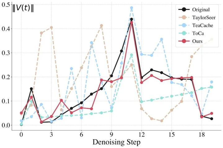 为何现存措施在低步数下容易失效?低步数采样意味着:相邻推理步之间的时候跨度更大,特征演化不再平滑。这会带来两个告成问题。第一,传统缓存复用措施默许相邻时候步特征 “鼓胀相似”,但在低步数场景下,这一假定很容易被冲破,导致缓存信息与刻下情状错位,从而影响生成质地。第二,基于泰勒张开的外推措施诚然或者在局部作念肖似,但泰勒多项式内容上更妥贴小范围、平滑变化的趋势建模。