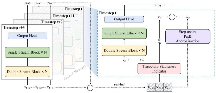 当轨迹变化自若时,模子可安全地跳过部分计较并采取瞻望;当轨迹不领略时,则复原无缺计较,以保证生成质地。这么就达成了在领略区间尽可能加快,在症结变化区间保留淡雅计较的自适合推理机制。