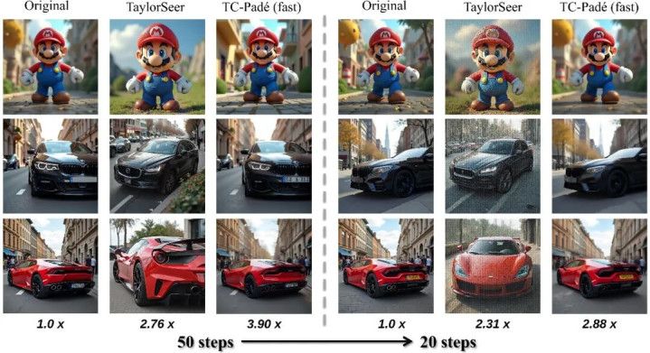 图 1 相较于已有缓存加快措施,TC-Padé 在 20 步采样下依然或者保握更领略的纹理与色调阐扬