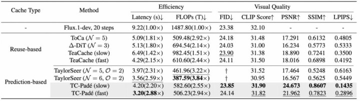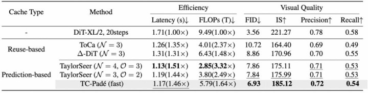 表 3 TC-Padé 在 DiT-XL/2 上的定量收尾,展示了其在类别要求图像生成任务中的领略泛化能力