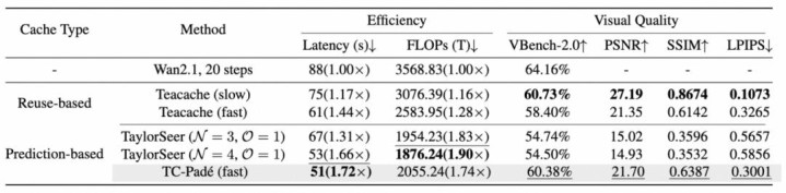 表 2 在视频生成任务中的着力对比。相较于其他措施,TC-Padé 在保证视频内容领略性的同期达成了更高着力