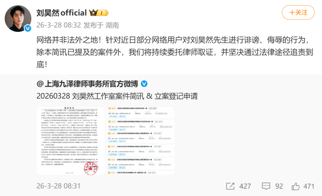 刘昊然方托付的律所发布公告暗示,“近期关连汇注平台上部分用户通过发布坏心握造的失实信息、贬低信息、侮辱信息,策画以此指导公众对刘源先生(艺名刘昊然)产生诬陷与质疑,旨在激发不解真相的公众针对刘源先生作出含糊性、负面性评价,已涉嫌侵害刘源先生的名誉权”,“本所已受托完成把柄保全,将向法院拿告状讼”。