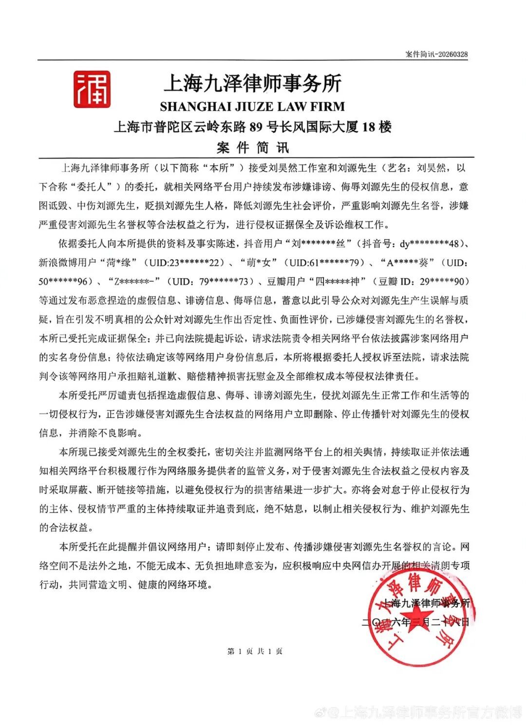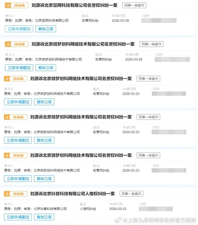 最新公告称,“短视频平台用户“刘*******丝”(dy********48)、微博用户“菏*缘”(UID:23******22)、“萌*女”(UID:61******79)、“A*****葵”(UID:50******96)、“Z******-”(UID:79******73)、豆瓣用户“四****神”(ID:29*****90)等通过发布坏心握造的失实信息、贬低信息、侮辱信息,策画以此指导公众对刘源先坐褥生诬陷与质疑,旨在激发不解真相的公众针对刘源先生作出含糊性、负面性评价,已涉嫌侵害刘源先生的名誉权,本所已受托完成把柄保全;并已向法院拿告状讼,请求法院责令关连汇注平台照章表现涉案汇注用户的实名身份信息:待照章详情该等汇注用户身份信息后,本所将根据托付东说念主授权诉至法院,请求法院判令该等汇注用户承担赔礼说念歉、补偿精神毁伤安危金及一皆维权老本等侵权法律累赘。”