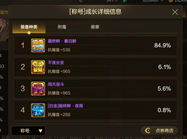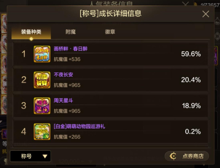 有玩家发现11万抗魔区间的氪佬中穿戴这次新春称号不夜长安的玩家只有6.1%,而另外一个新春称号周天星斗的玩家也只有5.6%,这加起来也不到15%啊。而穿戴以前老称号的玩家却有快85%了,这也就是说有至少八成的土豪还没有买新春套。