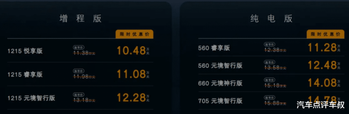 极狐阿尔法T5动作一款中型SUV,现在推出了限时优惠价,10.48万元起,其核心亮点在于,全系标配宁德期间电板,增程版空洞续航可达1215km,纯电版续航可达705km,且12万级的预算就能享受到城区NOA,是10~15万级商场中困难的高性价比车型。