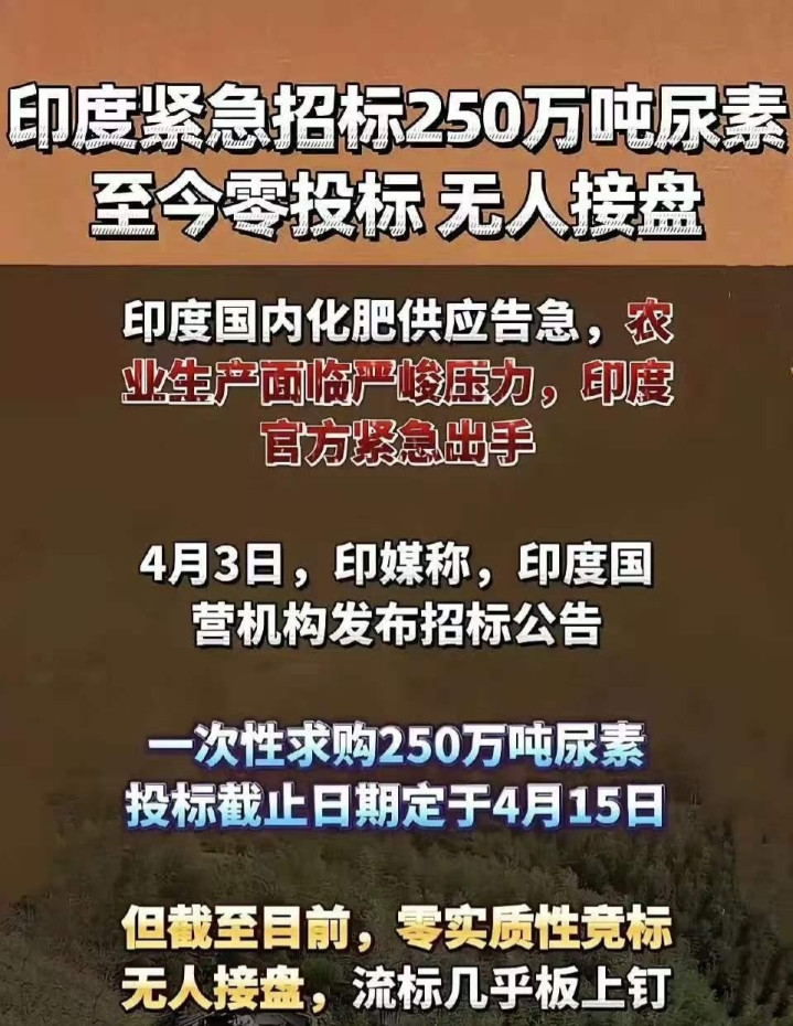 2026年4月,印度紧迫大家招标250万吨尿素,用来救春耕之急,效果直到胁制日历,一家供应商皆莫得,零投标,径直流标。