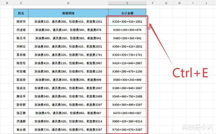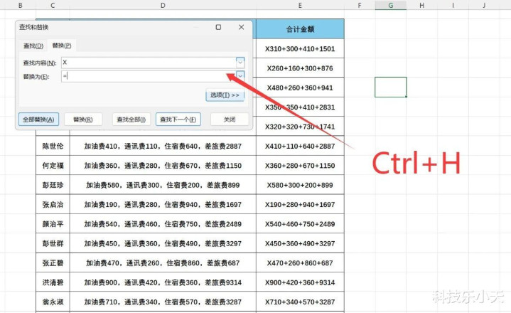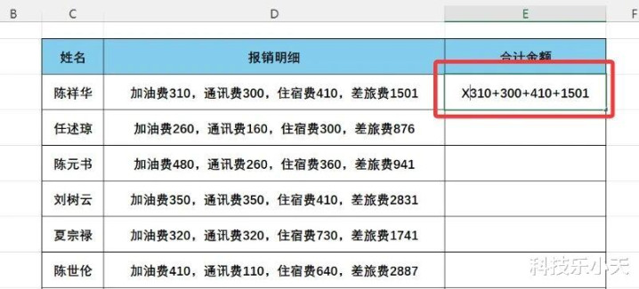 领先把报销单中第一个东谈主的数字用加号列出来,然后再前边加上一个率性英笔墨母,我这里就以X代替。