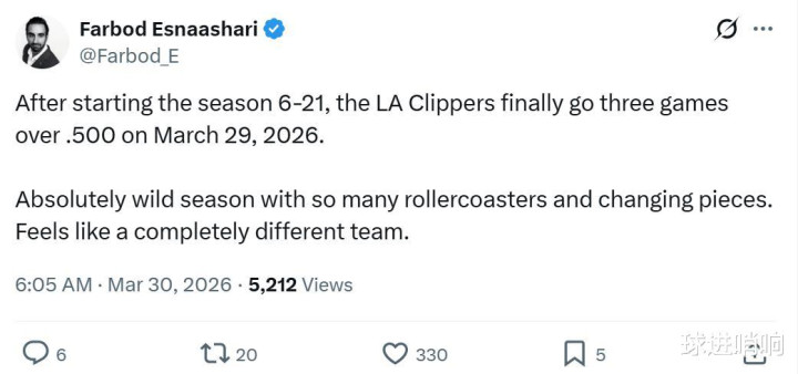 这一系列的佳音亦然这支快船队在成例赛中后段傲东谈主发挥的缩影,正如船记Farbod Esnaashari所说,关于快船队来说,这是一个号称过山车式纵容的赛季。