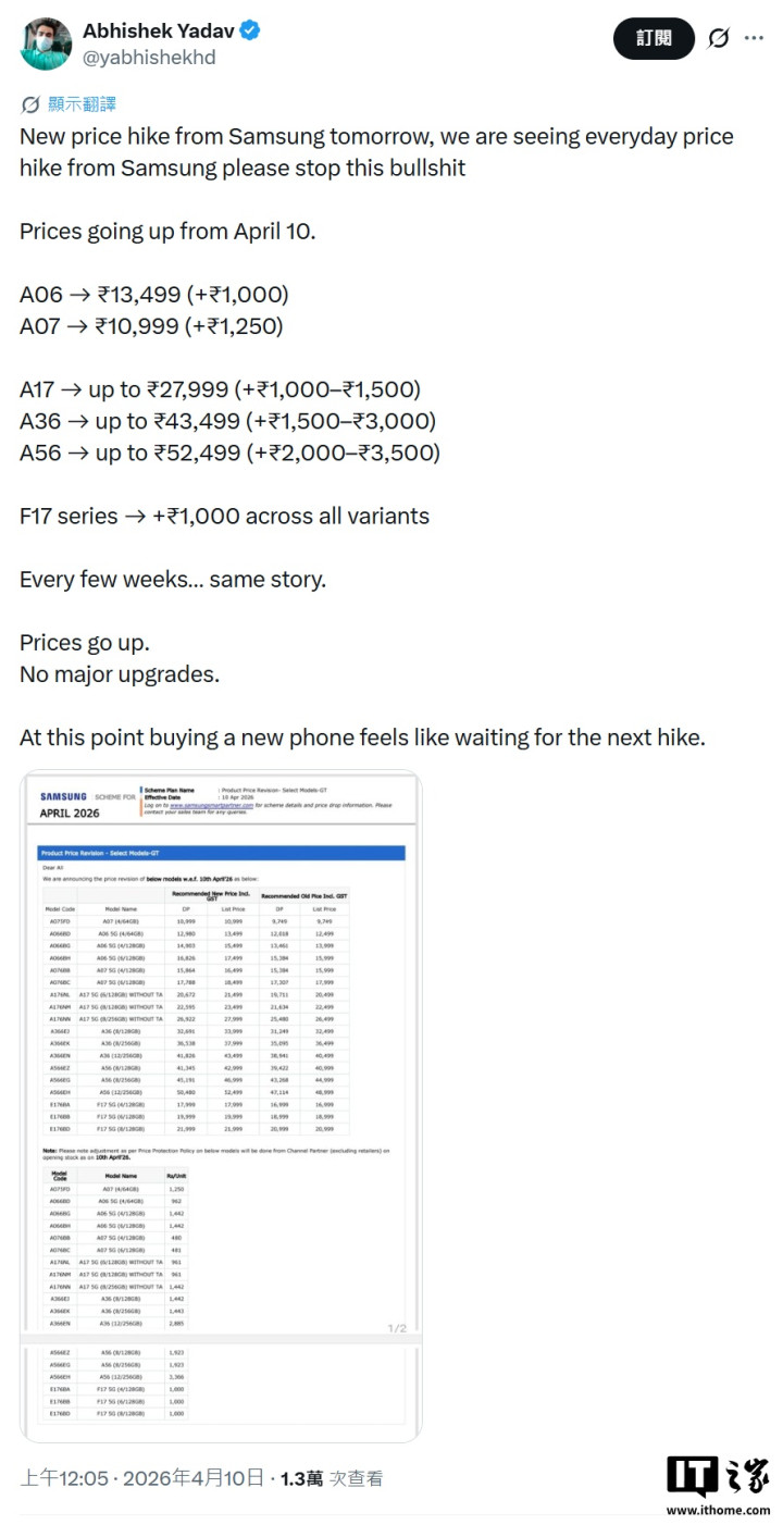 截图走漏,三星自2026年4月10日起将在印度调度多款机型价钱,A系列、F系列多款机型均有不同进度加价。